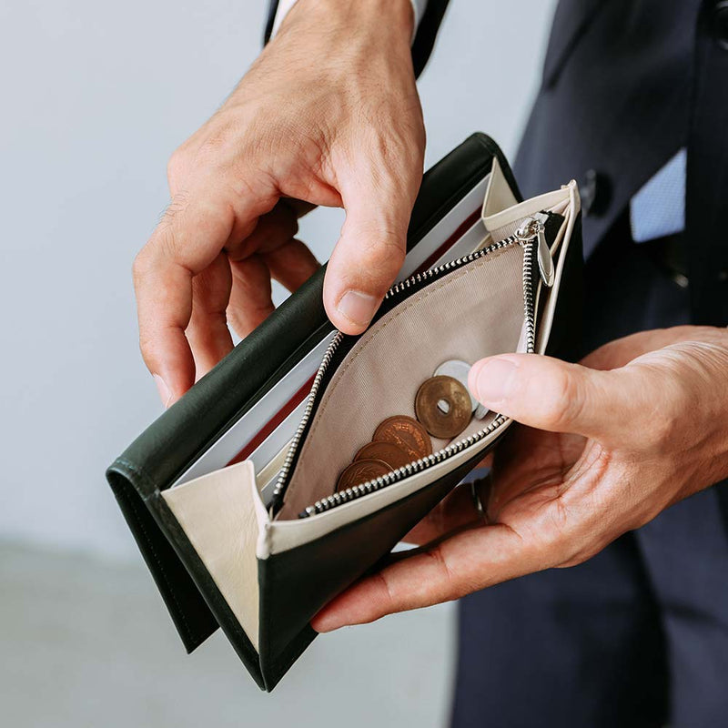 Genuine leather long wallet that can be personalised by combining colours in the pocket tiers. Right-angled corners give it a stylish look. Comfortably slim and not bulky in the pocket, yet functional with 13 card compartments and a shallow, easy-to-pull-out coin purse design. The perfect gift for those who like simple shapes.