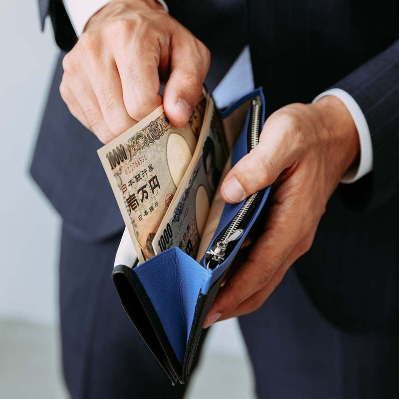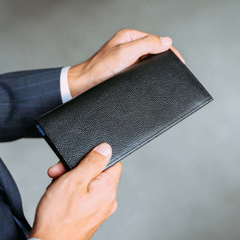 Luxurious feel created by embossed leather. Slim form with dignity, holds up to 13 cards. Comfortable slimness.