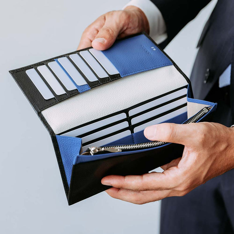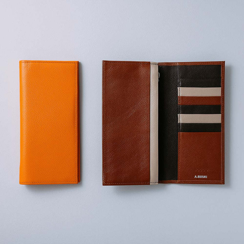 Embossed version of the popular slim long wallet. This genuine leather long wallet has a simple design that is enhanced by the embossed leather, which can be customised in seven different colours and can be personalised with playful touches such as pocket tiers. The right-angled corners give it a stylish look. It is comfortable and slim without being bulky in your pocket, yet functional with 13 card compartments and a shallow, easy-to-pull-out coin purse. The perfect gift for those who like simple shapes.