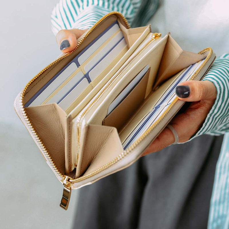 Pola timbul yang mewah pada kulit cocok untuk mereka yang mencari tampilan yang lebih dewasa. Dompet ini dapat dibuka hingga 100 derajat sehingga mudah dilihat dan memiliki kapasitas penyimpanan yang sangat baik dengan 14 slot kartu. Bicolor dan ritsleting berwarna emas memberikan sentuhan elegan pada dompet ini.