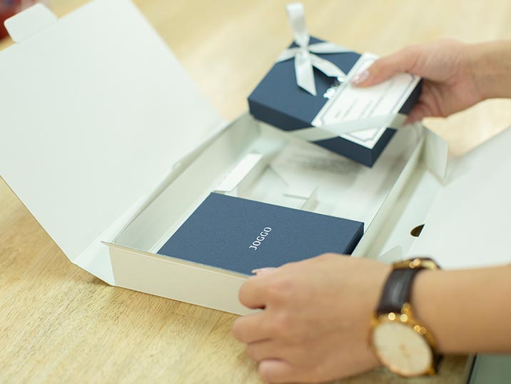 Untuk menciptakan momen indah dalam menyampaikan perasaan Anda, wrapping-nya pun harus elegan dan istimewa. Dompet akan dibungkus dengan kotak hadiah dan tas akan dibungkus dengan tas hadiah.